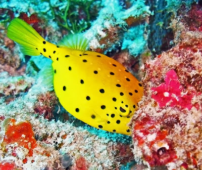 El Ostracion cubicus también conocido como pez cofre amarillo o pez cofre moteado, es un pez oriundo del Mar Rojo y el África Oriental. El mismo es difícil de confundir debido a su forma cúbica y su brillante color amarillo con manchas negras. Si bien los ejemplares machos superan los 45 cm en cautiverio solo llegan a la mitad de su tamaño. Su alimentación es a base de algas, moluscos e invertebrados. Siempre se encuentran en grupos en cercanías de corales y grupos de abundantes algas. Entre sus curiosidades nos encontramos una con respecto a su comportamiento, al sentirse intimidado o en peligro, libera toxinas intoxicando a los habitantes de su entorno inmediato, es por esta razón que solo es aconsejable entre los acuaristas para quienes solo son expertos en la materia. Entre otra curiosidad vinculada a la toxicidad de su carne es que esta lo lleva a ser invulnerable contra los demás peces, quienes nunca lo atacarán. Suele habitar en profundidades que llegan a los 300 metros.
